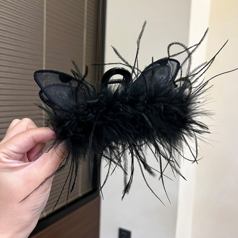 Cat-Ear Black Feather Claw Clip – 13 cm