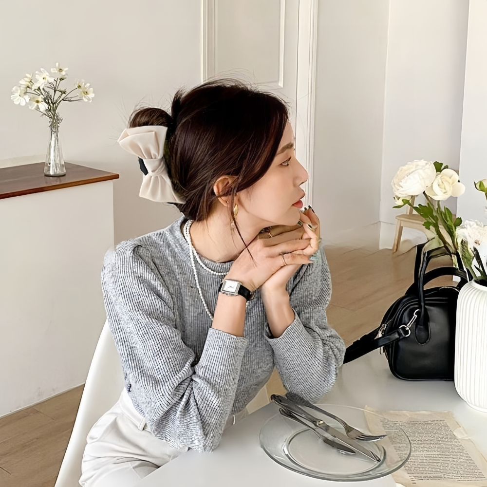 Beige Pearl Bow Double-Sided Clip – Fresh and delicate