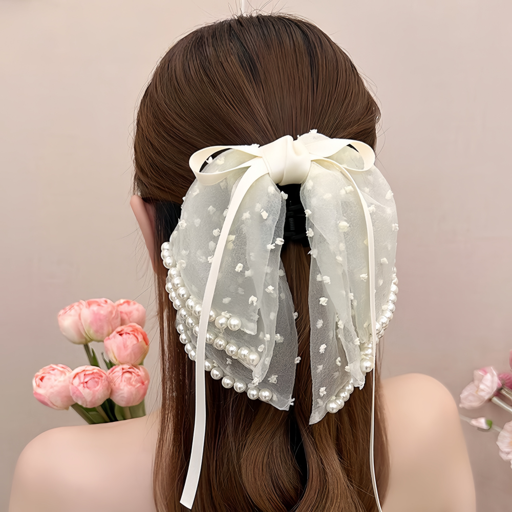 Bring a touch of luxury to your styling routine with this beautiful pearl ribbon hair clamp—a must-have accessory for creating effortlessly elegant looks.